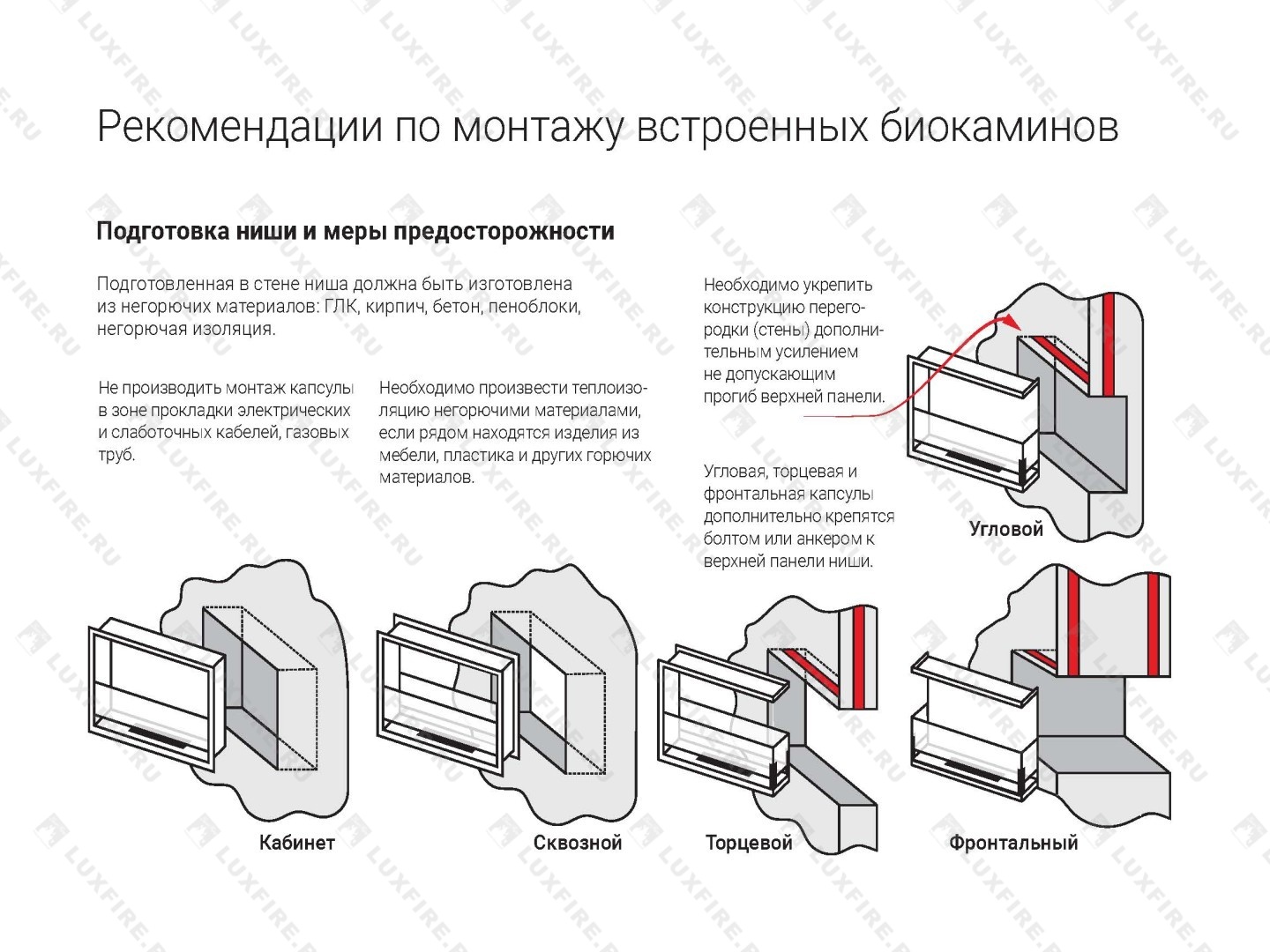 Встраиваемые варианты разделяются на такие как классические, устанавливаемые в подготовленное отверстие в стене или нише. Угловые, которые монтируются в угловую часть стены. Торцевые – открытые с трёх сторон. И сквозные, вид живого огня которых доступен в разных комнатах.
