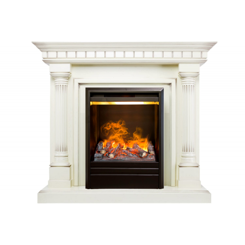 Каминокомплект «Dallas» укомплектован современным паровым очагом «3D Olympic» от производителя Real Flame. Небольшие габариты изделия компенсируются более широкой относительно всей конструкции столешницей, благодаря чему камин одинаково хорошо будет смотреться в помещениях любой площади. Эффектность конструкции также достигается за счет контрастного сочетания светлого портала и черного очага. Но за счет использования темной патины такой контраст выглядит не слишком резким.
