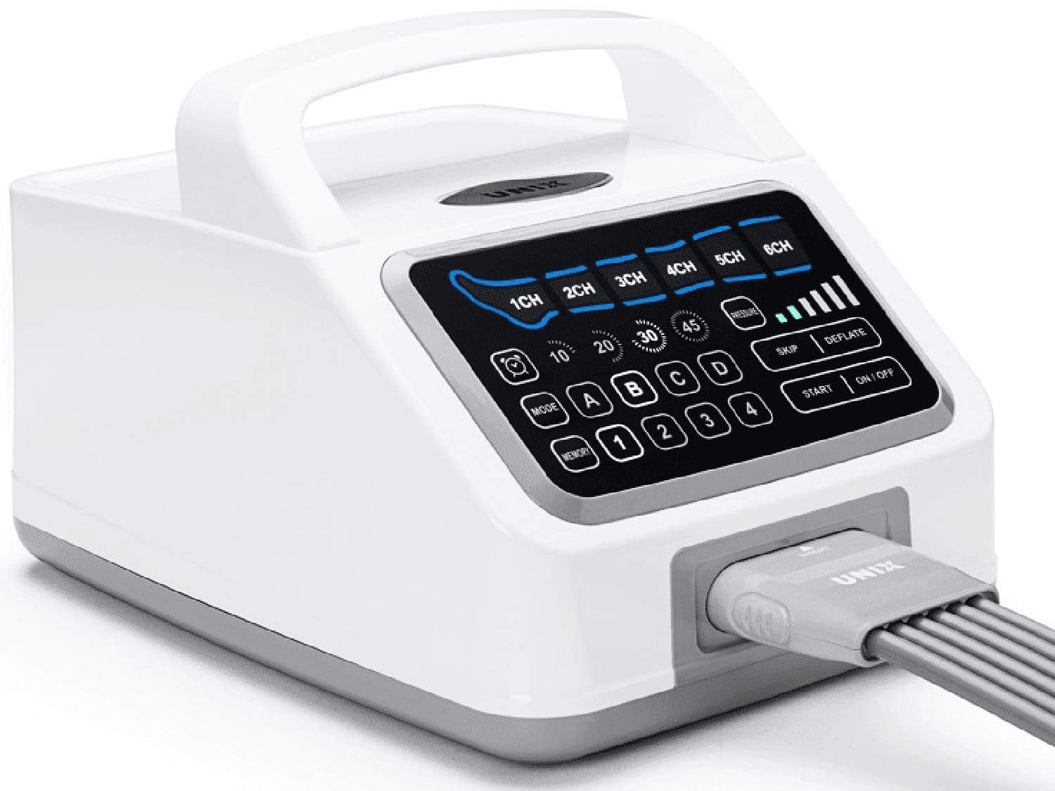 Принцип действия устройства заключается в том, что 6 камер манжеты последовательно накачиваются воздухом и также последовательно освобождаются от него. Клиент испытывает прохождение упругой волны по конечности, на которую надета манжета.Для безопасности пациентов на рабочем экране предусмотрена кнопка Пропуск. Это очень важная функция, которая позволяет отключить заполнение воздухом какого-то фрагмента манжеты. Это нужно, если пациент испытывает неприятные ощущения локально.